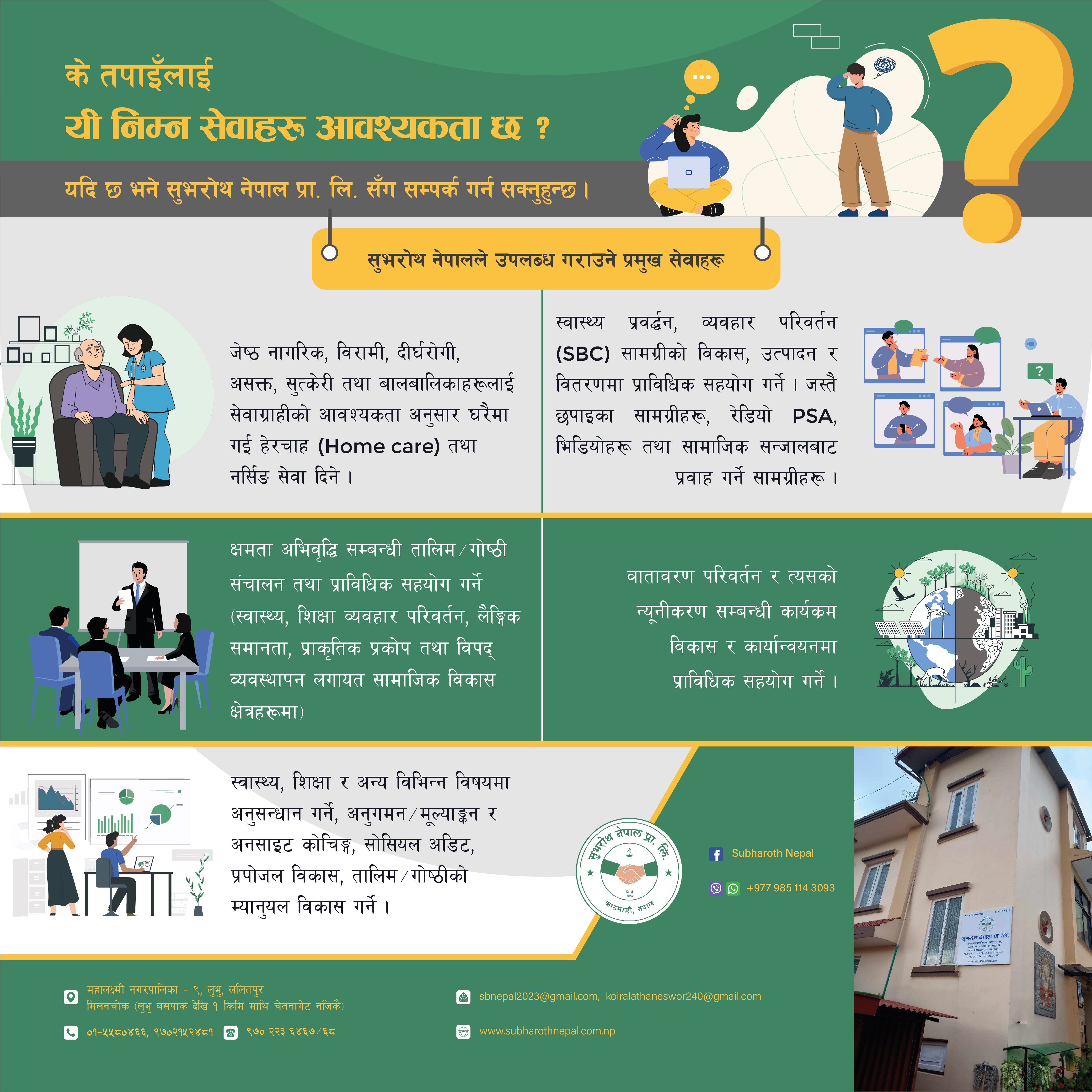 Welcome to Subharoth Nepal (SN) Private Limited (Pvt. Ltd), the newly established Health care service and consulting agency run by an experienced, and qualified professionals of Multi-Disciplinary (MDT) team in Nepal. Our goal is to provide high-quality health care services at the desired place (home-based) and provide consultancy services related to communications and various types of technical training to enhance the capacity of an organization and its staff.